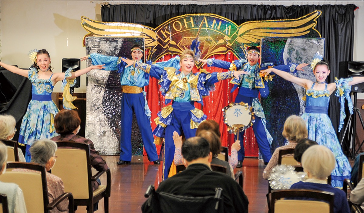 歌劇団は約50人の入居者を前に、歌舞伎舞踊や昭和の名曲、シャンソンを披露。代表の鳳あづまさんは「職員の皆さんに力強く支えていただいて実現できた」と感謝を込めた。企画した(株)ネクサスケアの逆瀬川真一さんは「ようやくイベントを再開できた。ご入居者様に喜んでもらえてよかった」と振り返った。