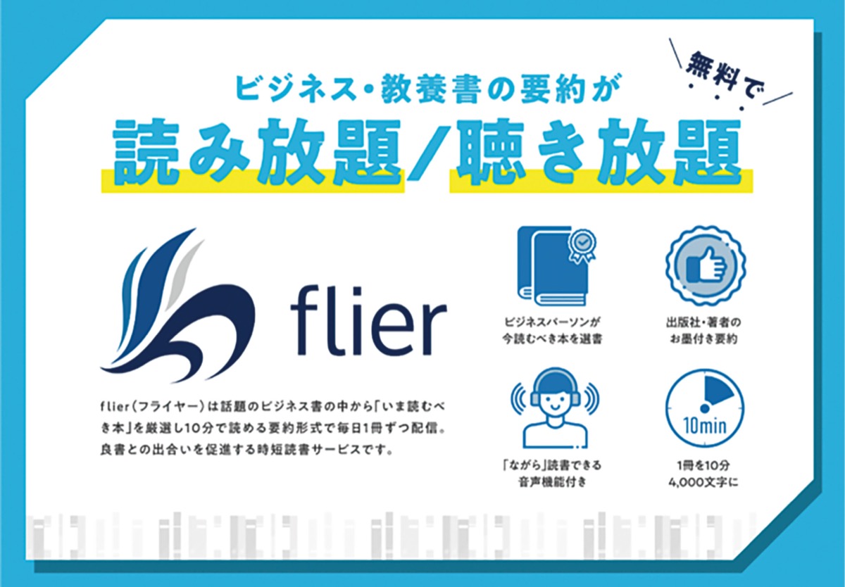 「フライヤー」とは、株式会社フライヤーが運営するウェブサービス。ビジネス書や実用書、教養書、自己啓発本など、ビジネスパーソンに話題の書籍を要約して掲載している。10分程度で読める長さのため、通勤時間などを活用し、教養やスキルを身につけられると、働く人などの間で利用されているサービスだ。毎日1冊ずつ配信され、現在は約2900冊に対応。月額定額制で個人利用できる。