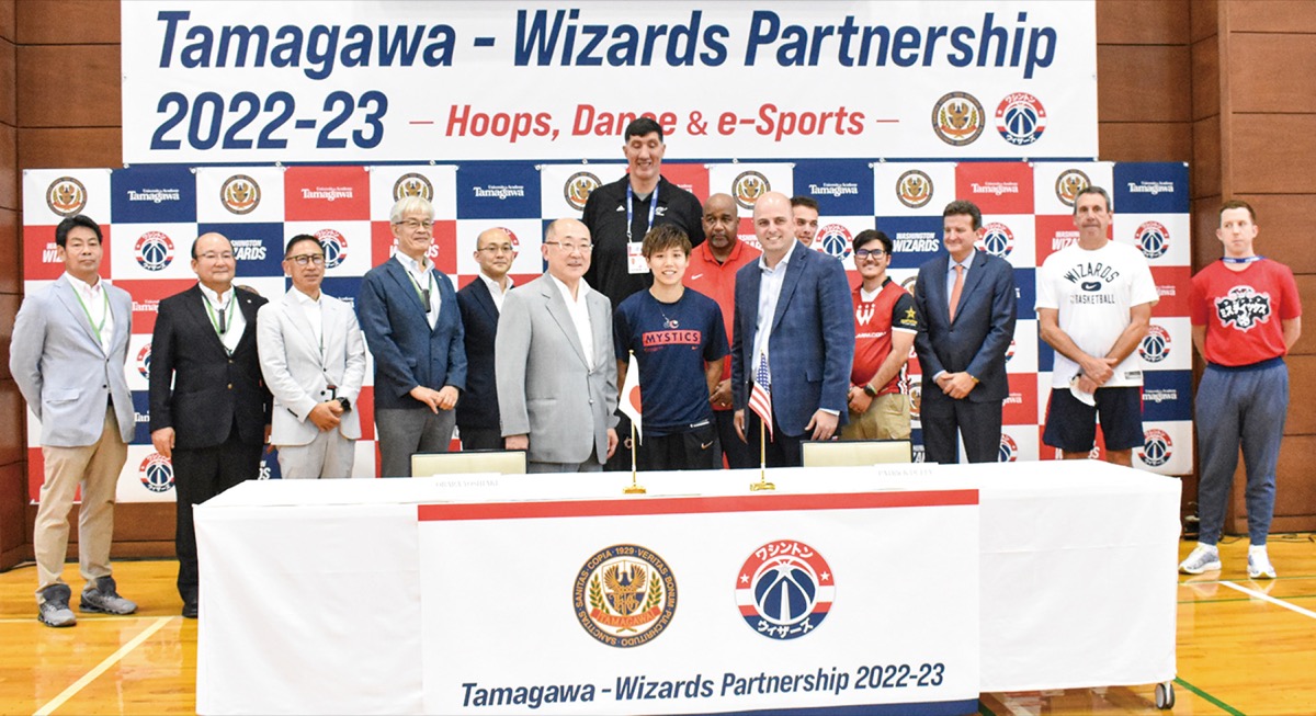 玉川学園(小原芳明理事長)が全米プロバスケットボール協会(NBA)の所属チーム「ワシントン・ウィザーズ」などを運営するMSE社とパートナーシップ契約を締結し10月1日、同学園記念体育館で調印式を行った=上写真。日本の学校法人とNBAチームのパートナーシップ契約は初めて。