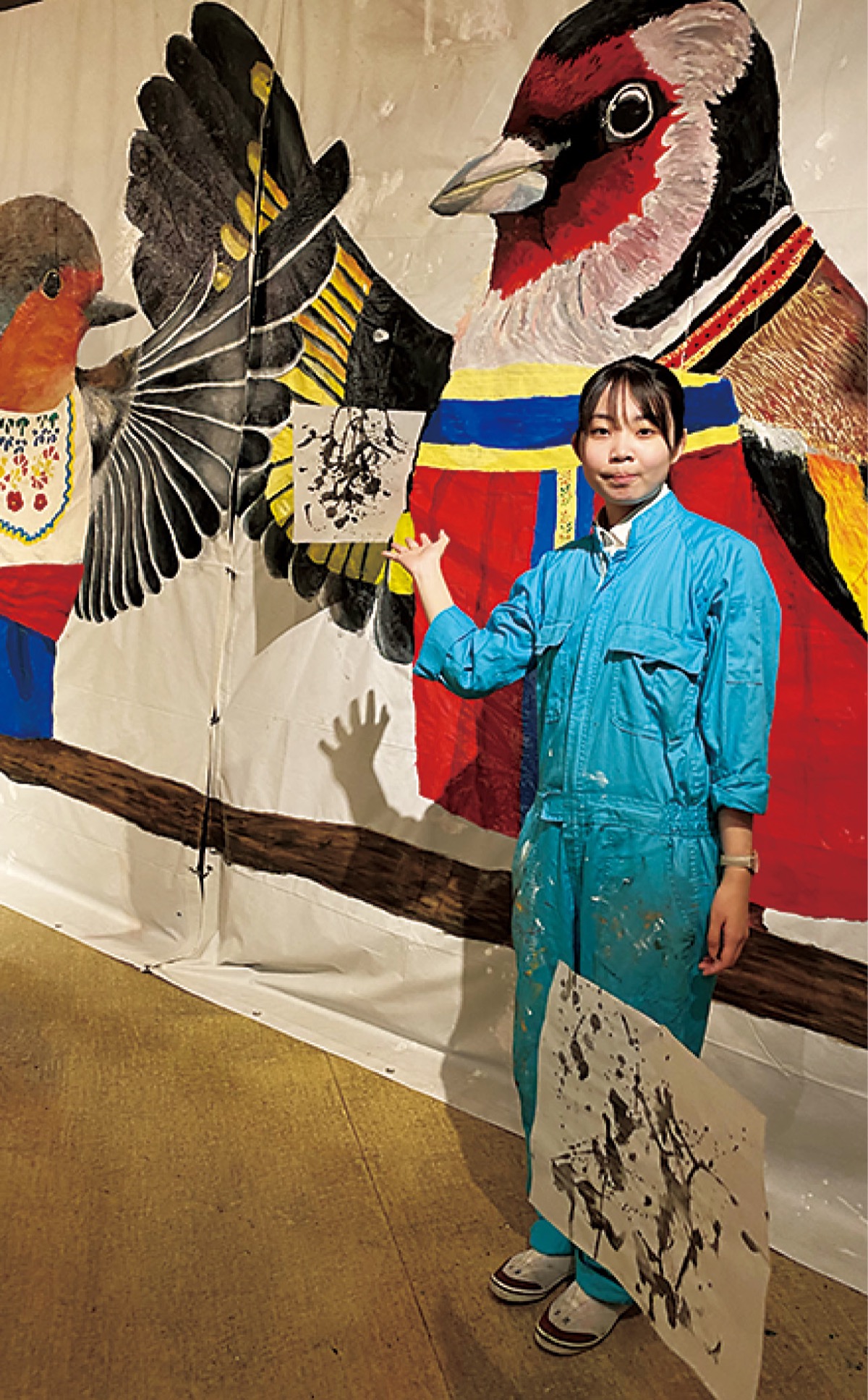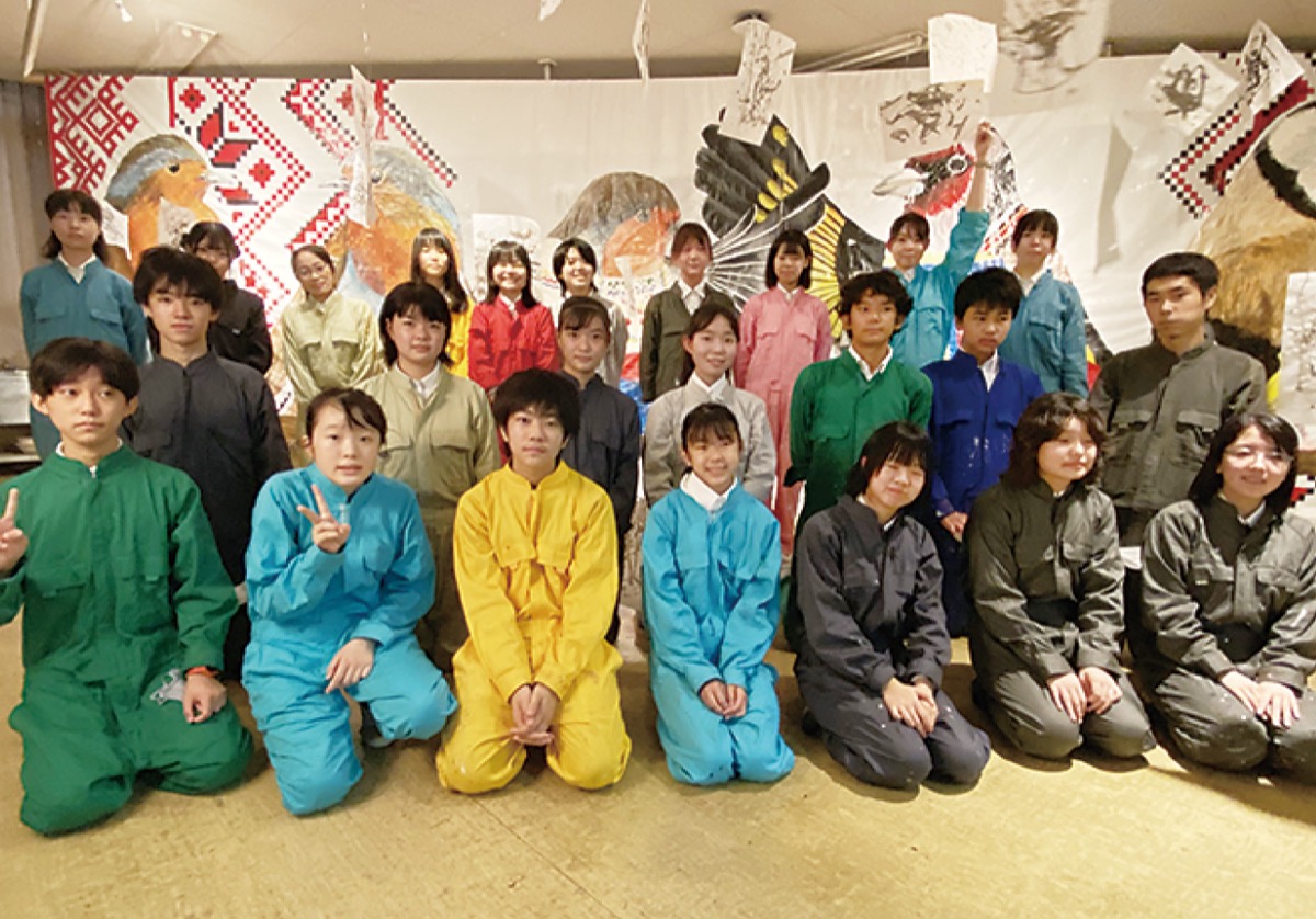 桜美林中・高の文化祭が先月行われ、美術部の部員約30人が制作した縦3・6m×横10・8mの巨大な作品が展示された。戦争の収束と平和を願い、ウクライナとロシアの国鳥と民族衣装を描いた作品は、部員らが両国の文化を調べたり、ニュースや書籍から得た知識からウクライナの伝統装飾である「ペトリキフカ塗り」を取り入れた。部長の足立美優さんは「2年間文化祭ができず、1から大きな作品を作るのが初めてで達成感が物凄かった。塗りのワークショップにも大勢が訪れてくれて良かった」と感想を述べた。