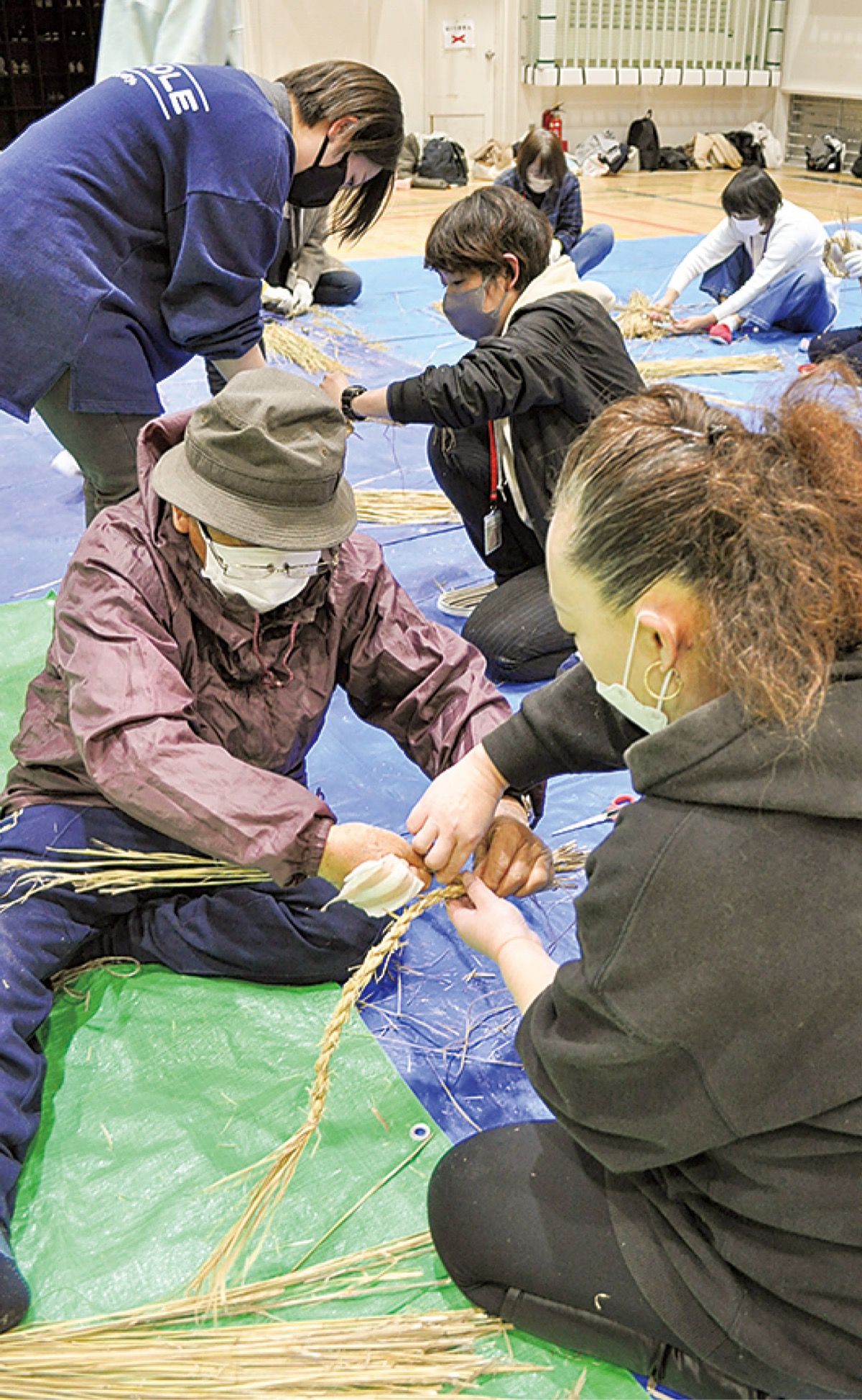 野菜作りや昔遊びなどで児童らと交流している鶴寿会の矢島会長は「平均年齢は80歳。会のクラブ活動もコロナ禍で中止になったり、集まりが悪くなっている。独居家庭も増えており、出てくるメンバーも減った。本来は我々が直接児童に教えればいいのだが、人数が揃わず力仕事も難しい。こうして親を巻き込んで伝承できれば」と話す。また「しめ飾りは簡単に買えるものだが、体験することで、地域に田んぼがあることなども心に残るはず」と意義を話す。保護者の一人、赤木英美さんは「子どもが楽しみにしているので仕事を休んで参加した。この地域ならではの体験。自分が子どもの頃も経験しなかったから、難しいけど楽しい」と話していた。