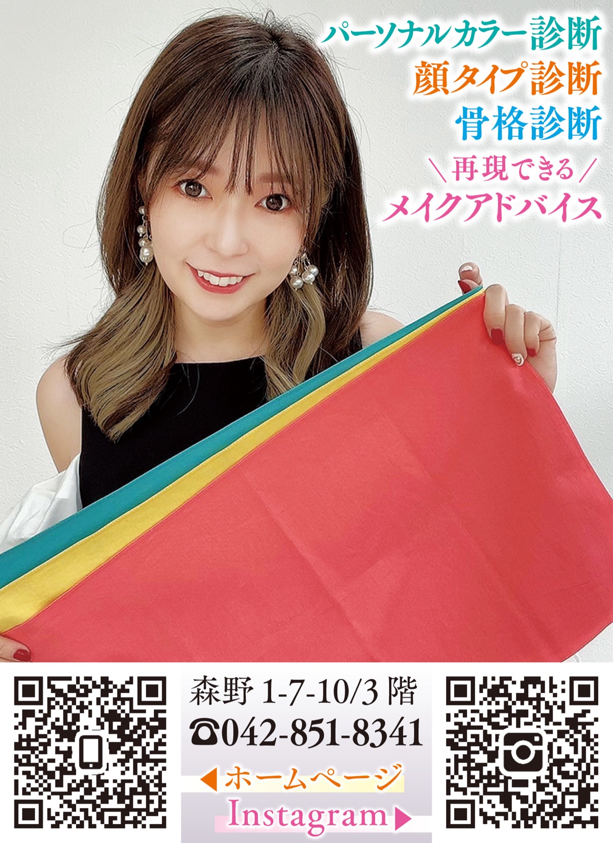 その人に似合う色、メイク、服装、髪型などをトータルでアドバイスし、魅力をみつけ、自己肯定感を高めるサロン。自分で再現できるメイクアドバイスやファッション提案が評判で、サロンを訪れた人は皆、笑顔で「来て良かった、このまま買い物に行きます」と大喜びで帰っていくとか。