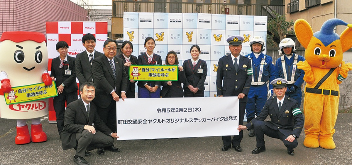 これは市内に6事業所を構える神奈川東部ヤクルト販売(株)と町田警察署、町田市が協働で行う取組。同社が応募し参画した、町田市地域活動サポートオフィスが支援する「ふだんの活動にプラスON 交通安全・防犯協働事業」の一環で行われた。