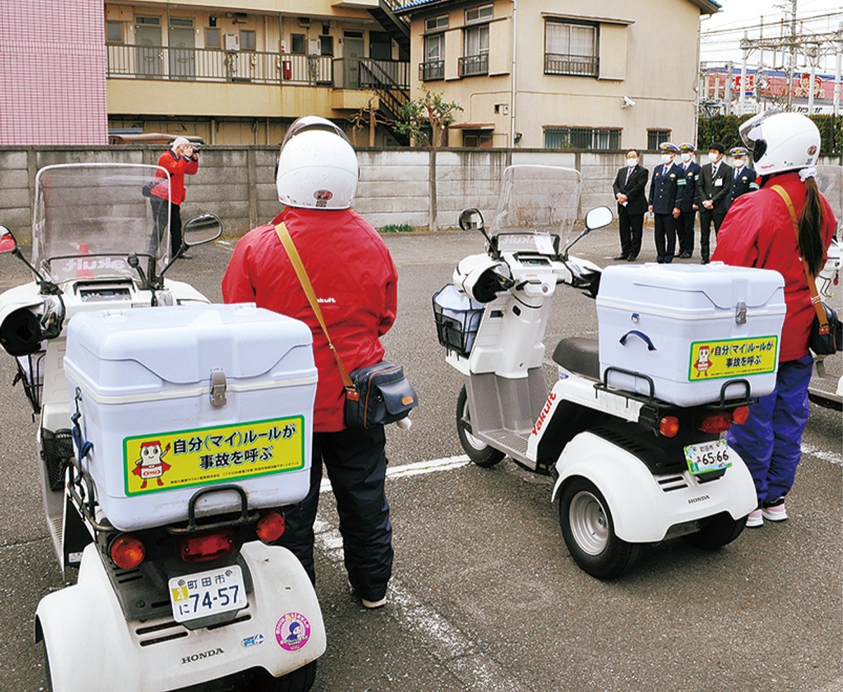 町田市内で業務しているヤクルトレディ(女性販売員)が乗るバイクに啓発ステッカーを貼り、市民に交通安全を呼びかけるため2月2日、「町田交通安全ヤクルトオリジナルステッカーバイク出発式」が旭町の町田交通安全協会の敷地内で行われた。