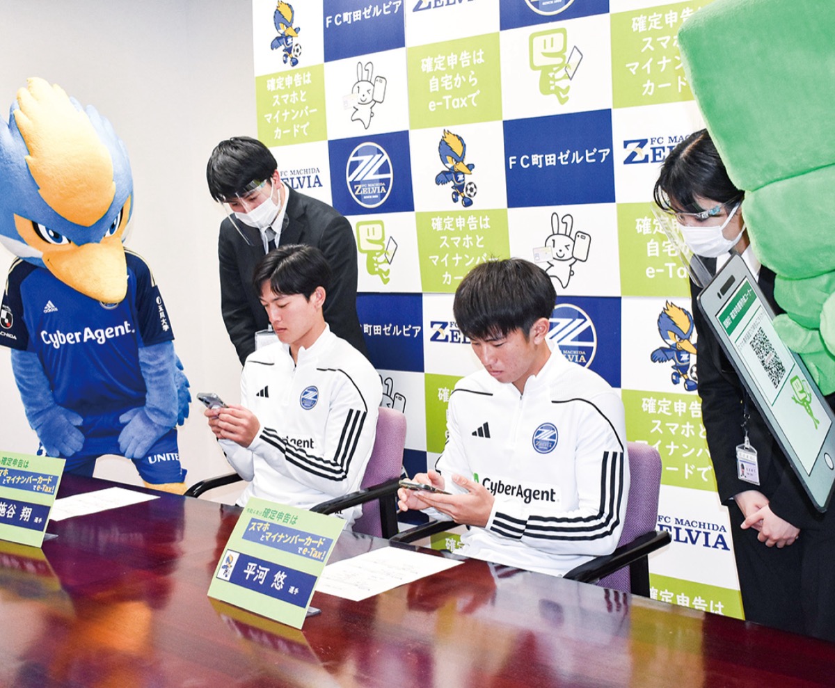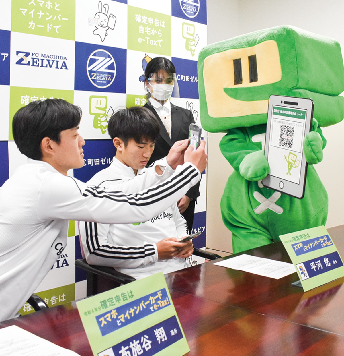 2月16日から始まった確定申告期間に先駆け、町田税務署で8日、FC町田ゼルビアの選手がスマホで行う確定申告を体験した。