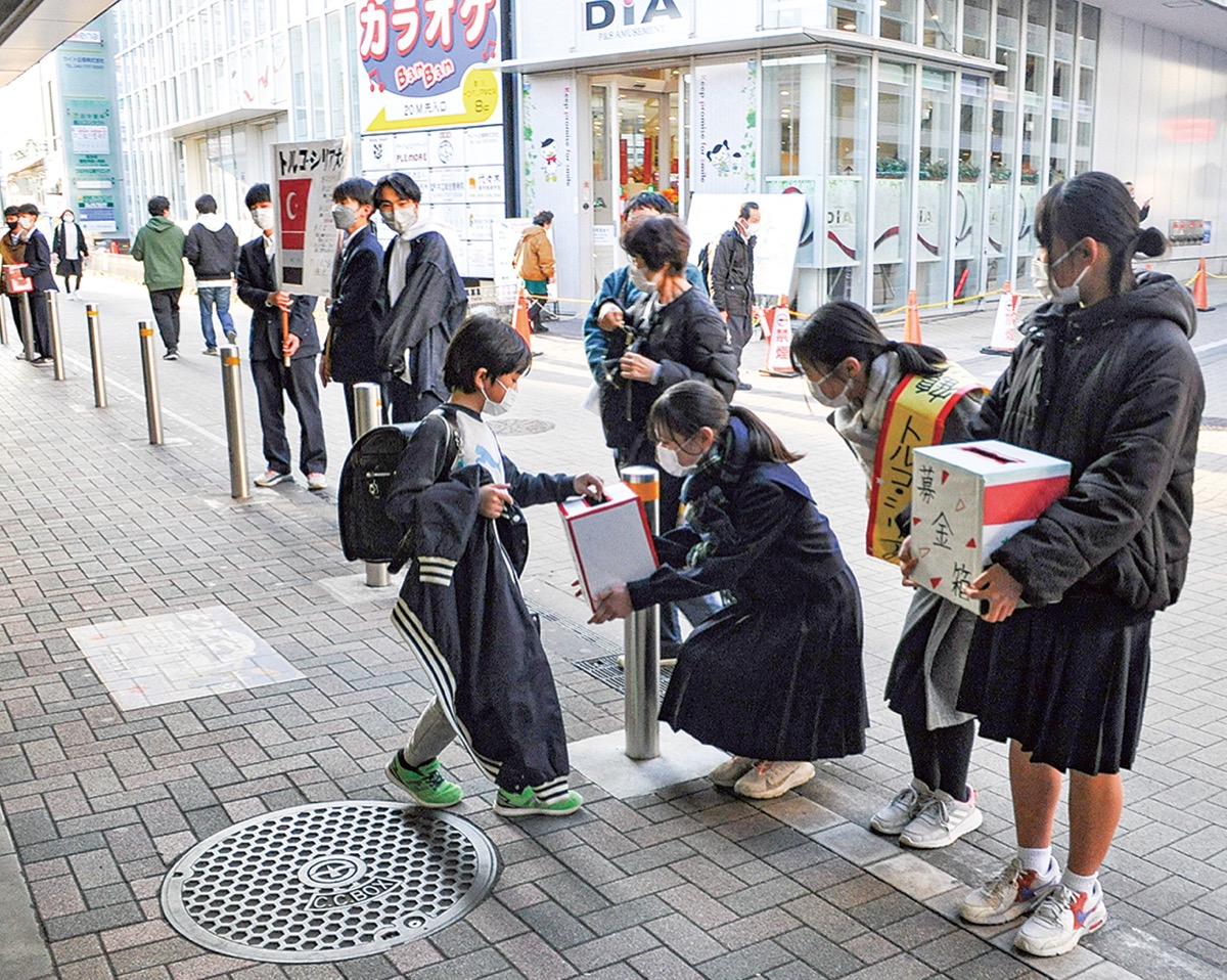 生徒らが周辺3カ所に分かれて駅利用者らに呼び掛けると、多くの人が募金箱に硬貨や紙幣を入れ、「頑張ってね」と声をかける高齢者や、同中のOBだという高校生、中には学校帰りの小学生の姿も見られた。2年学級委員長の福見心菜さん(14)は「東日本大震災の時は私たちは小さくて、記憶にはないが、映像を見たり、話を聞いたりして、他国の人が支援してくれたことを知った。今回の私たちの活動で、被災した人たちに生きる希望を与えられたら」と話し、大勢の人たちの協力を喜んだ。集まった募金は赤十字社を通じて現地に送られ、被災者の支援に役立てられるという。