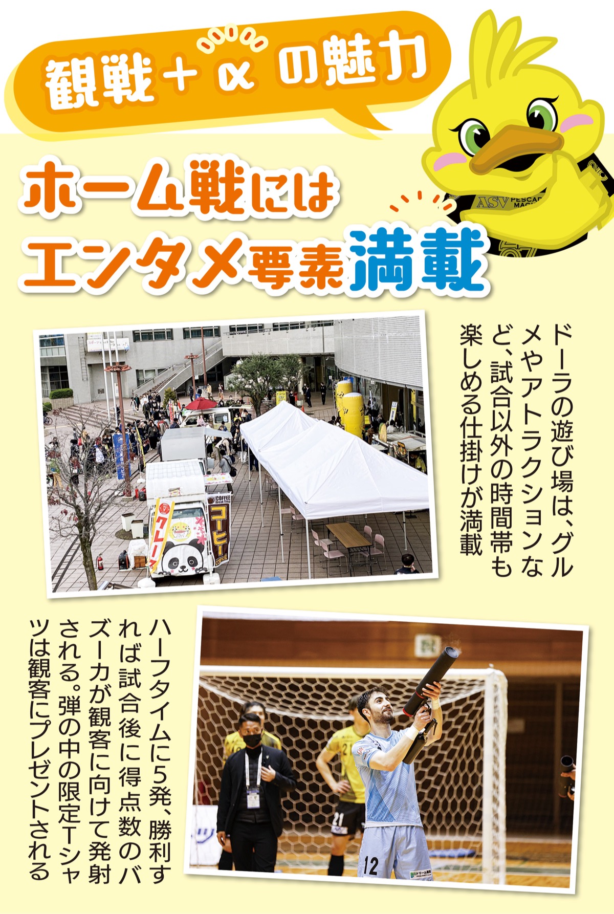 関野 ホームゲームでは試合以外の時間帯もご来場の皆様に楽しんでいただけるよう、様々な仕掛けを行っていて、エンタメエリアを「ドーラの遊び場」と命名しました。地元グルメのキッチンカーや露店、アトラクションなど、サポーターはもちろん、初めて来場された方々にも大変好評で、アリーナの空気が変わったと感じています。特に「ドーラの遊び場」は、体育館の外から見ても、何かやっているとすぐわかるので、試合を見に来た方以外にも興味を持っていただけます。その中でも注目を集めたのが「アルパカふれあいコーナー」です。アルパカを飼育されているのは町田市内の福祉事業者で、もともとチームとお付き合いがある中で「フットサル界で前例のないことをやろう」という私達の気持ちに賛同してくださり実現したものです。これらの要素が相まって、私たちチームの熱意が地域の方々を巻き込みホーム戦の入場者数1位という喜ばしい結果に繋がったと考えています。