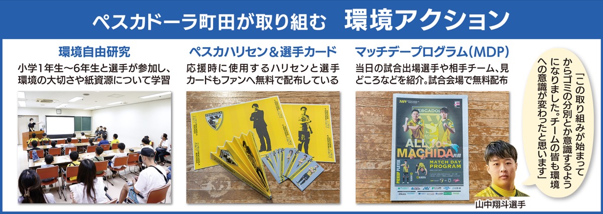 関野 最初は「環境」への取組で、マッチデープログラム(以下MDP)をFリーグでは初となる再生紙にすることでした。ホーム戦だと多い時は2千部程度のMDPを印刷します。以前は余ったMDPは廃棄していたのですが今は回収しエプソンさんの技術を用いて新たな紙に生まれ変わらせています。毎回再生紙で作成し無駄も出さない。地道な取り組みながらも大きな一歩と考えています。そんなMDPから始まってハリセンや選手カードも再生紙で作るようになりました。去年の夏休みにはエプソンさんから講師を招き、小学生を対象に自然環境についてレクチャーをする環境自由研究を行いました。7・8月の2回の開催はすぐに満員になり、選手も一緒になって自然の大切さを学びました。