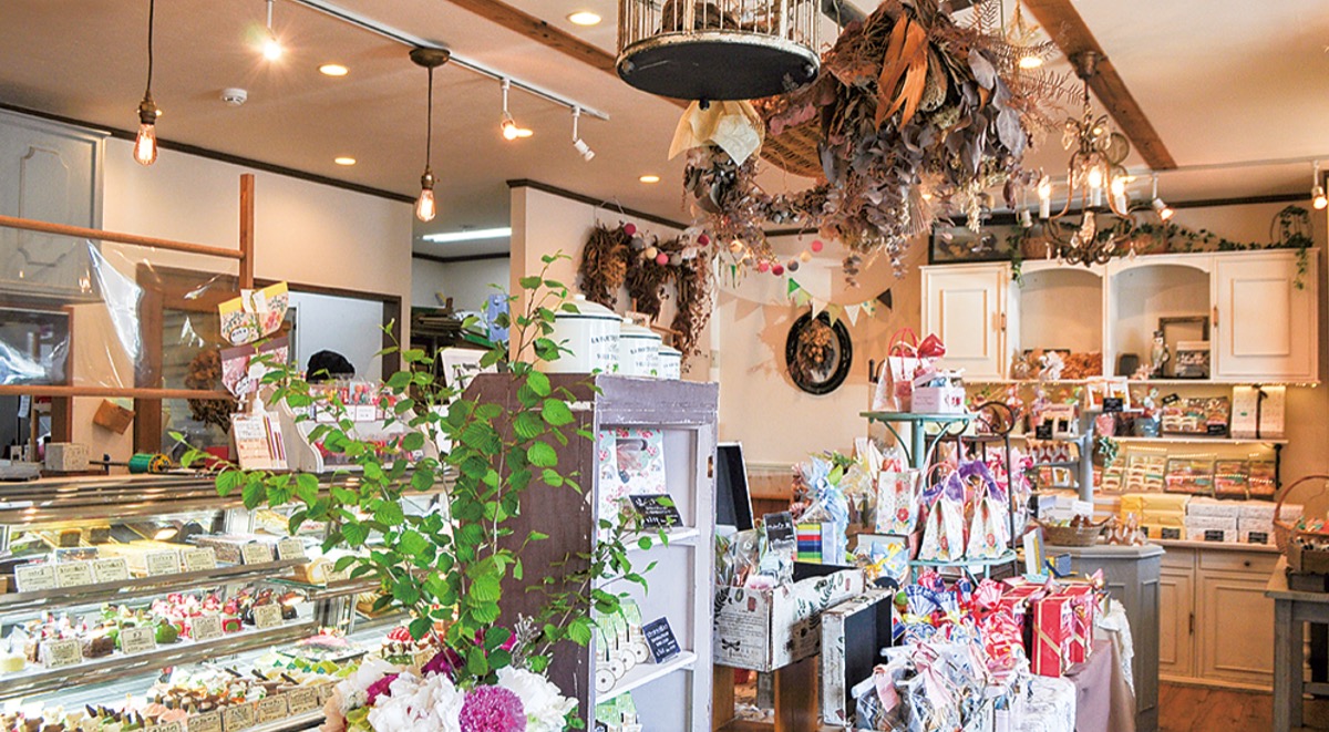 忠生に店を構えるケーキ店・スイーツガーデンバニラシュガー。可愛らしい店内には色とりどりのスイーツが並ぶ。