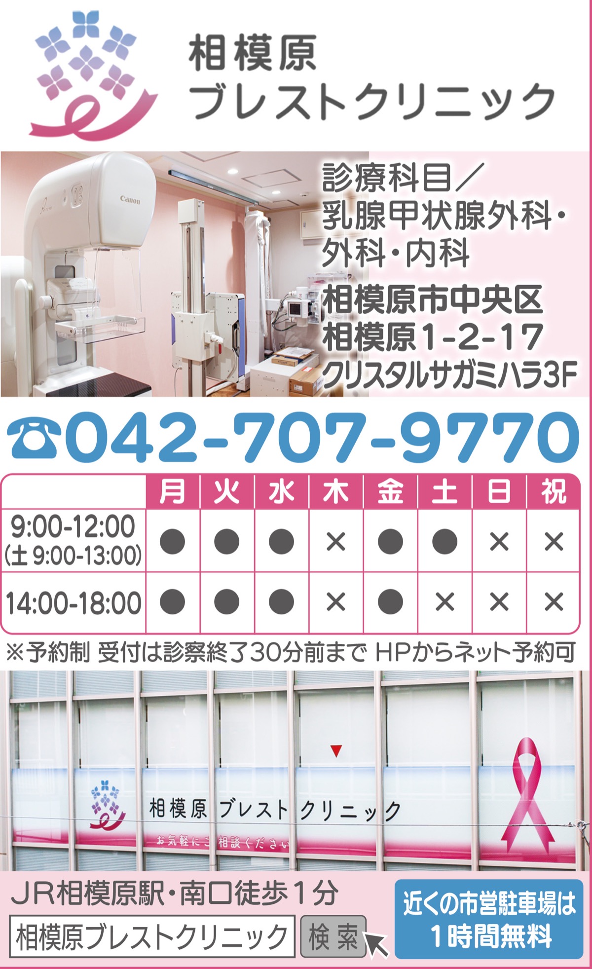 JR横浜線相模原駅南口徒歩1分の場所にこの春、乳がんの検診・診療を行う「相模原ブレストクリニック」が開院した。相模原市の北里大学病院や相模原赤十字病院などで乳がんを専門としてきた小坂愉賢氏が院長を務めるクリニックで、乳がん検診のためのX線撮影「マンモグラフィ」や超音波(エコー)による診断が可能。近親者に乳がん経験者がいる人の相談に乗る「遺伝カウンセリング」、乳がん術後の経過観察などを受けもってくれる。
