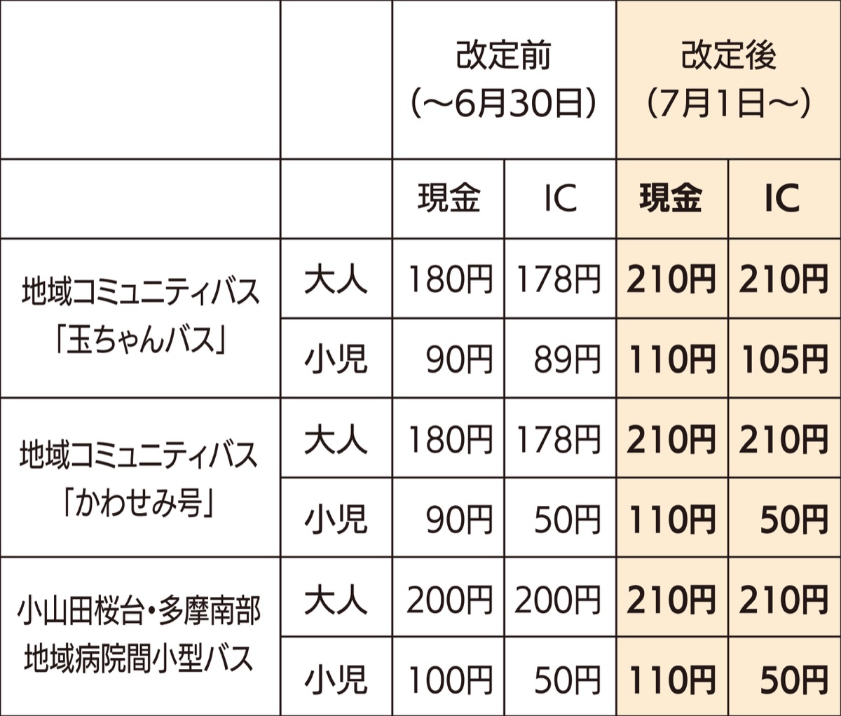 町田市内を走る地域コミュニティバスの運賃が7月1日(土)から改定される。最大32円(IC運賃)の値上がりとなり、玉川学園地区内で運行する「玉ちゃんバス」と金森地区の「かわせみ号」のほか、小山田桜台から多摩南部地域病院間を走る小型バスも対象となる。