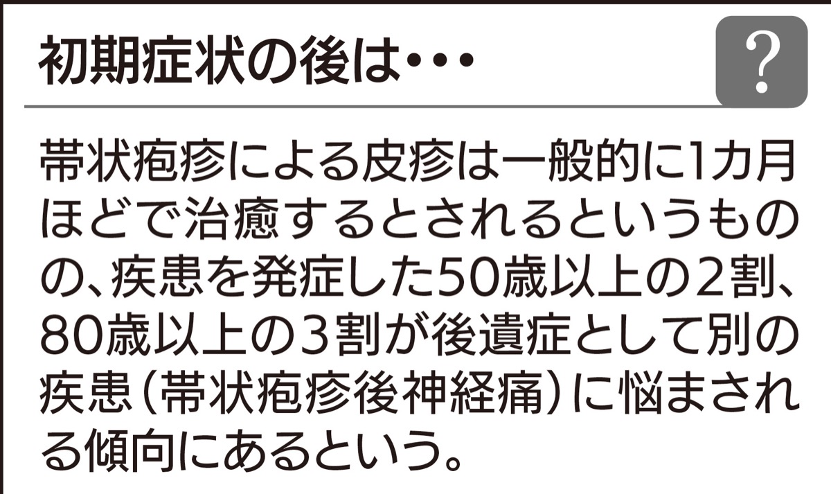 帯状疱疹は子どもの頃に感染する水ぼうそうのウイルスが原因で起こる疾患で、体内に潜み続けたそのウイルスが加齢やストレスなどで免疫力が下がった際に再活性化。「ピリピリ」「チクチク」と例えられる神経痛から始まり、次第に痛みを感じる部分に発疹などが現れるようになるという。