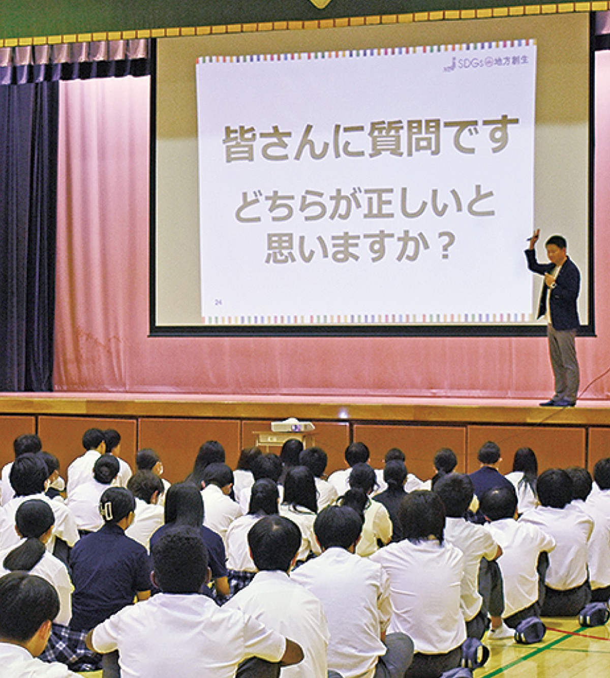 この授業は町谷校長が「答えのない問いを考える力を養ってほしい」と初めて企画。2学期からは山崎町に繰り出し地域の人と共に探究活動を行う予定だという。各クラスで発表会を行った後は、体育館に集まりJCメンバーの市川展久さんからSDGsを例に課題解決への考え方や問いの立て方などの講義を受けた=写真左。