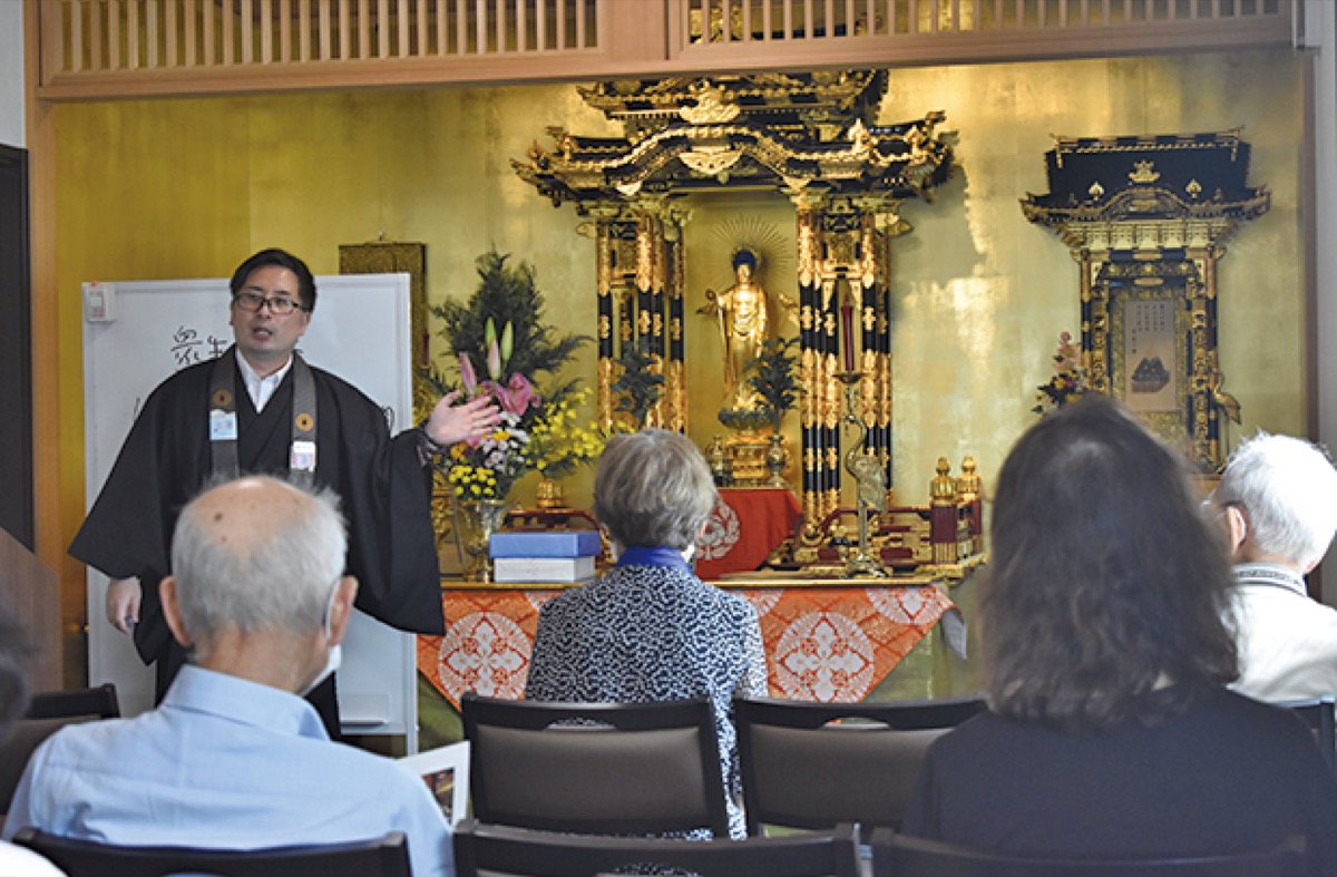 成瀬にある往還寺(真宗大谷派)の本堂で7月29日、浄土真宗のお盆法要である盂蘭盆会が行われた。12人が参加し、全員で読経と焼香をした後、東京教区駐在教導の寺本智真さん=写真=の法話に耳を傾けた。
