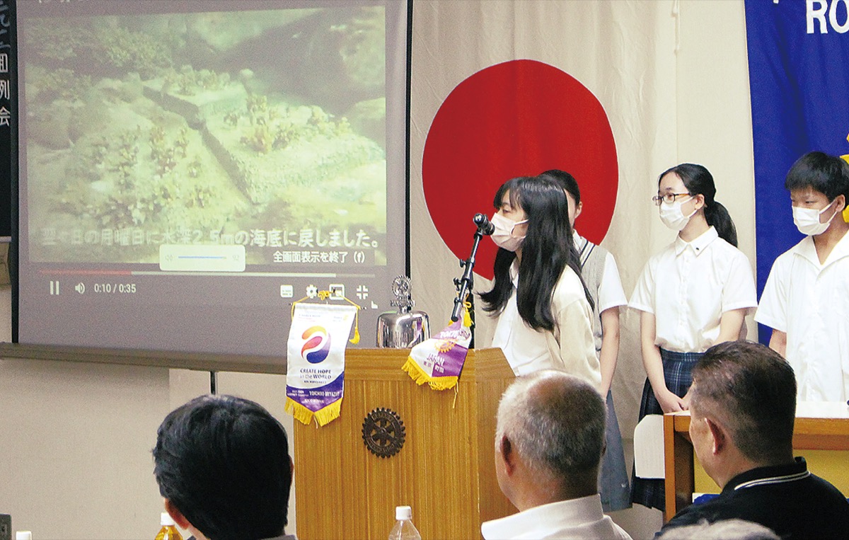 地球温暖化が海洋のサンゴに与える影響などについて、全4回にわたり考えていくもので、この日が初回となった。同部生徒らはサンゴを研究・飼育している様子などを発表し、耳を傾けたクラブ会員のなかにはメモを取り、熱心に聞き入る姿もあった。