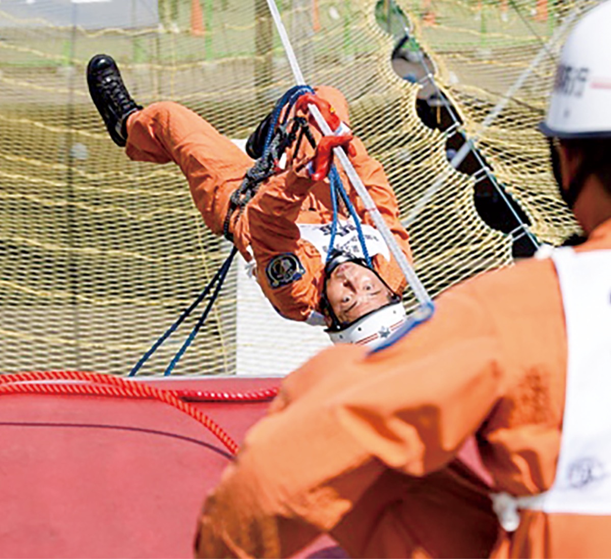 同大会は消防の救助技術の訓練成果を確認するもの。ロープブリッジ救出は、要救助者を隣の建物から進入し救出することを想定した訓練で、4人1組となり、塔と塔の間に張られた20メートルのロープを利用し対面する塔上へ進入。要救助者を救出ロープに吊り下げてけん引し、救出した後に脱出するまでの所要時間や安全確実性を評価する。
