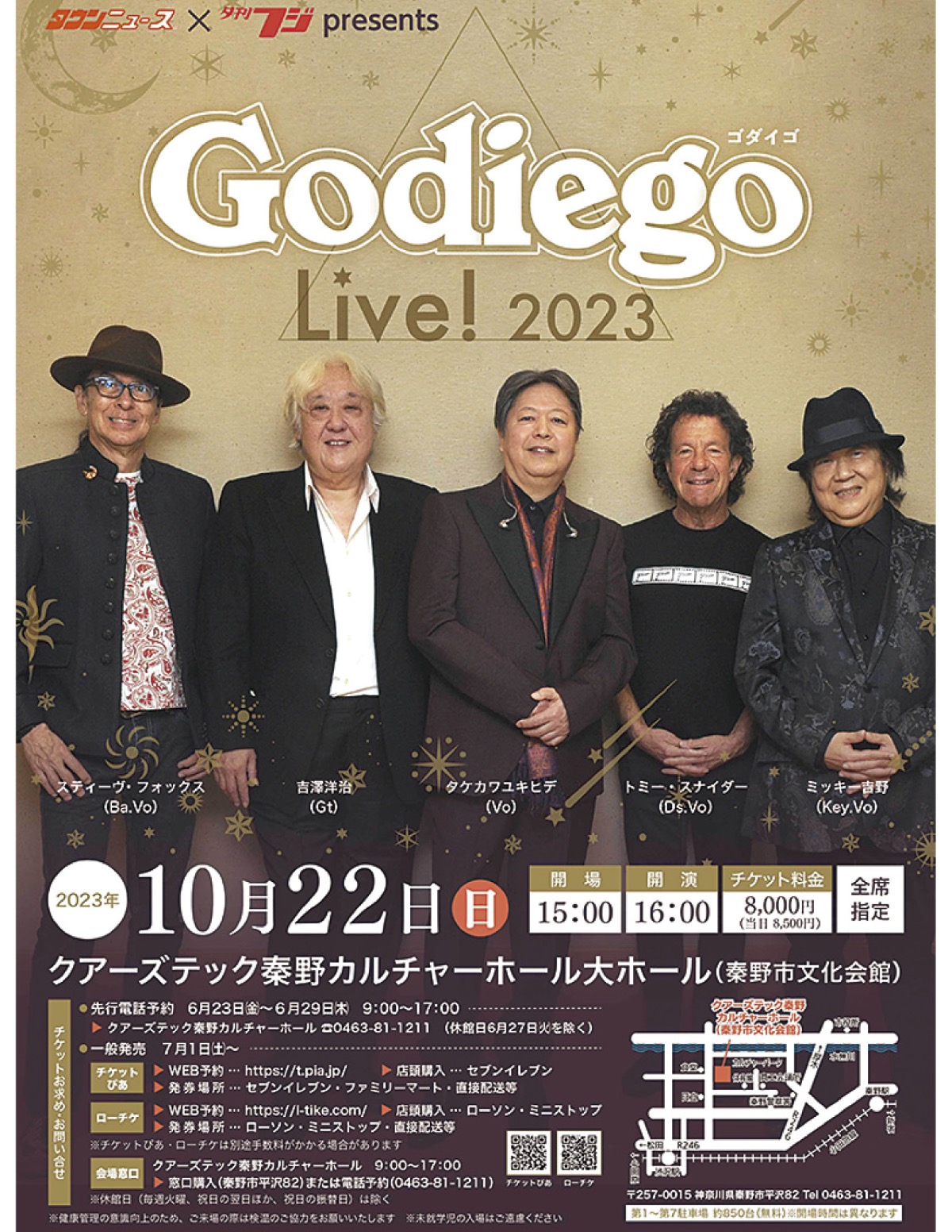 今秋から本格的に活動を再開する不朽のロックバンド、Godiego(ゴダイゴ)のスペシャルライブ「Godiego Live! 2023」が10月22日(日)、クアーズテック秦野カルチャーホール(神奈川県秦野市)で開催される=写真。地域情報紙タウンニュースと夕刊フジ合同のライブ企画第3弾。「銀河鉄道999」「モンキー・マジック」「ガンダーラ」など名曲群が丹沢の山並みにこだまする。出演はゴダイゴほか。チケットは前売り8千円、当日8千5百円(全席指定)。購入は▼チケットぴあ(Pコード245―929)▼ローチケ(Lコード72413)などで。(問)【電話】0463・81・1211へ。