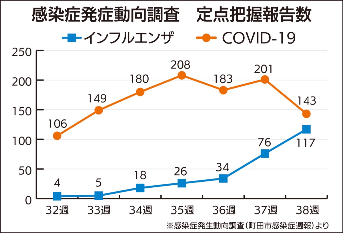感染者数は9月18日から24日(38週)までの間で定点当たり117人。一昨年や昨年の同時期は感染者が見られなかったものの、今年は右肩上がりの状態が続いているという。市内学校ではインフルエンザ流行による学級閉鎖が発生し、その数は9月20日時点で6学級に。市保健所担当者は「例年は12月から流行し始める。新型コロナウイルスとの同時流行が心配。注意してもらいたい」と呼びかける。