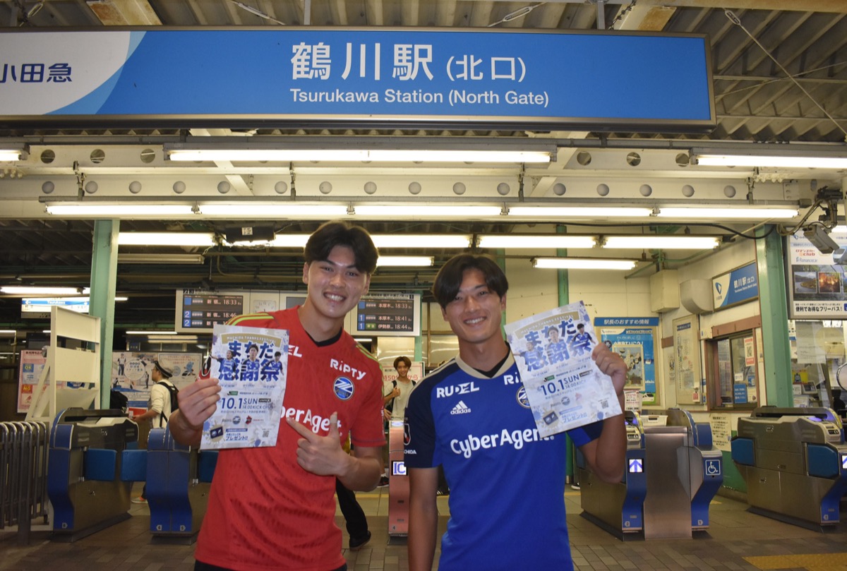 FC町田ゼルビアは9月27日、10月1日のホームゲーム選で行われた「まちだ感謝祭」に先立ち、試合告知と集客、日ごろの感謝を伝えることを目的に、小田急線鶴川駅前でチラシ300枚の配布活動を行った。