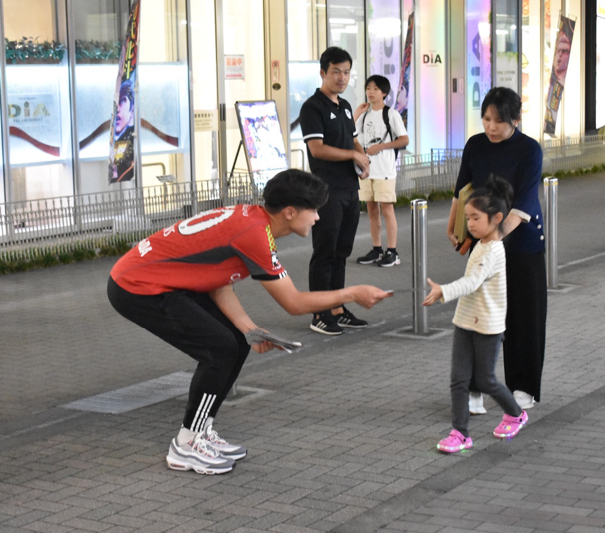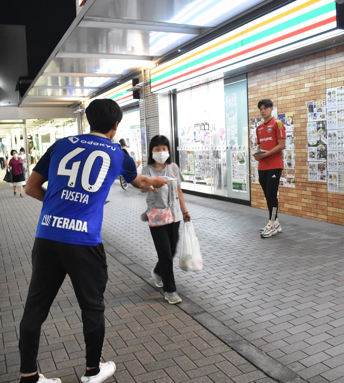 チームからはスタッフだけでなく、バーンズ・アントン選手と布施谷翔選手も街頭に立ち、自らチラシを通行人に手渡した。