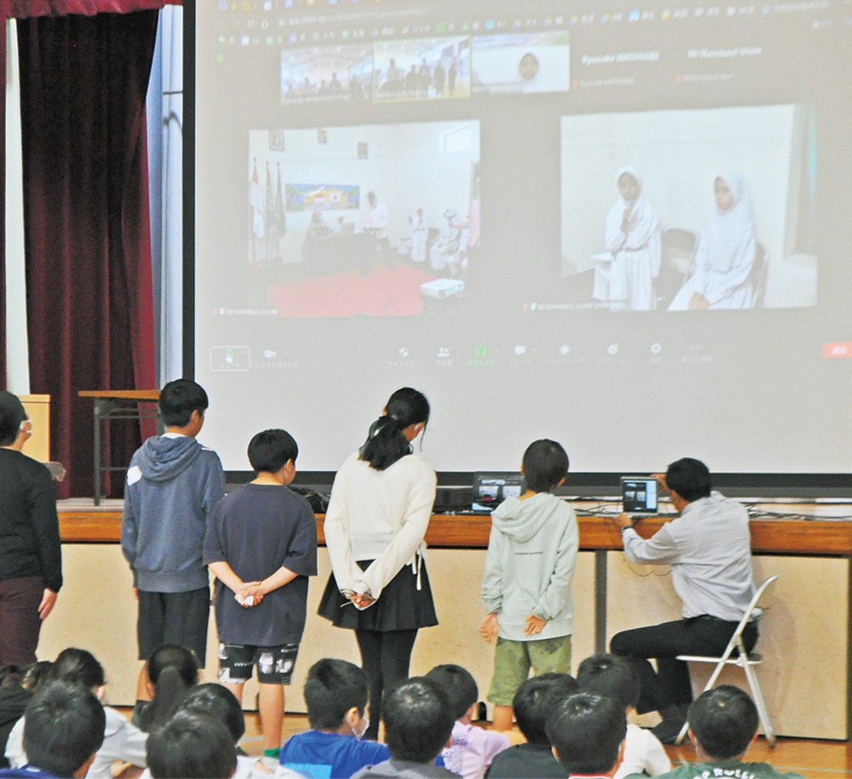 後半には児童同士で行う質疑応答が行われ、「好きなインドネシア料理・日本料理は」「学校の魅力的なところは」などを聞き合う時間が設けられ、児童らが興味深そうに画面を眺める様子が見られた。