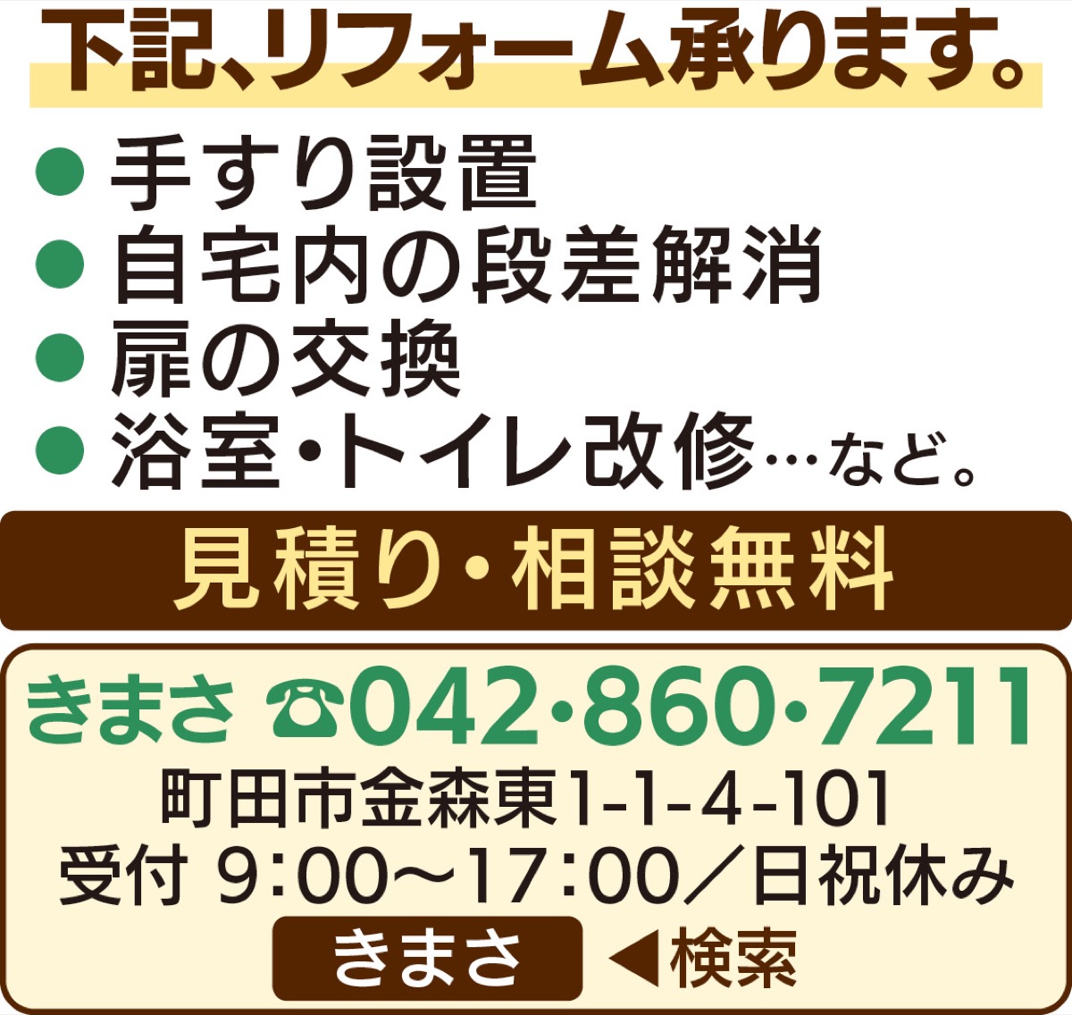 「いつまでも安心して我が家で暮らしたい」――という思いから、自宅をバリアフリーリフォームする人が増えているようだ。そんななか、多くの依頼を受けているのが、金森東の(株)きまさ。住む人にやさしい自然素材の建材を使用し、依頼者の声を生かしたバリアフリーリフォームを実施。信頼を集めている。同社が受けつけるのは手すりの設置や段差解消、浴室・トイレの改修など。大野雅己代表は「年齢を重ねても住みやすい家づくりのお手伝いができれば」としている。