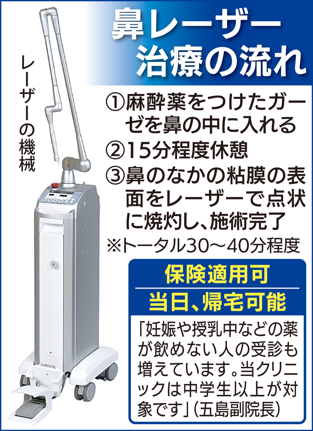 同クリニックの五島史行・副院長は「花粉症は症状が出る前の対策が重要。その手段の一つがレーザー治療で、花粉が飛散し始める2月前に受診するのが有効。1月中であれば、まだ間に合います」と話している。