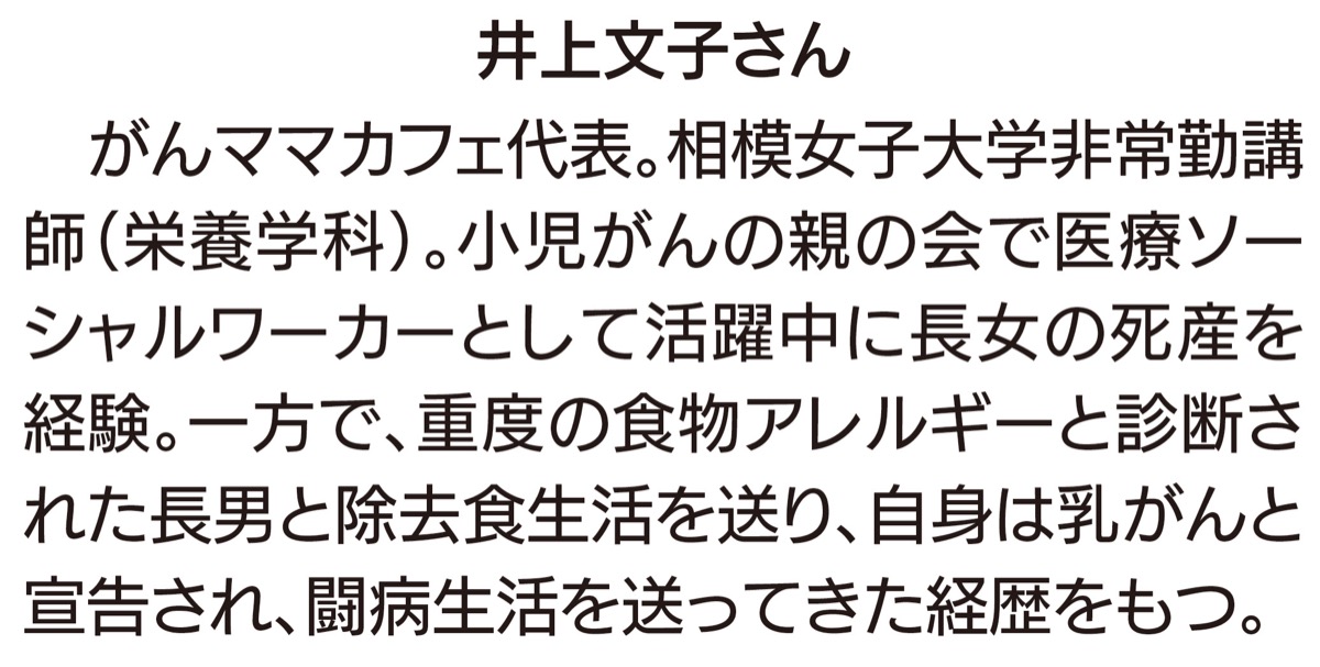 がんと診断された子育て中の母親らの集まりの代表を務め、死産などを経験した井上文子さん=写真=と子育てについて語り合う会が2月27日(火)、常盤町の桜美林大学内で開かれる。保護者らが子育てなどについて語り合う場として桜美林幼稚園などが主催する講座「ほっこりカフェ」の一環で、死産や食物アレルギーの子どもと歩んできた経験をもち、がんの闘病生活を送ってきた井上さんの話を聞くことができる。また、当日は交流会形式で参加者が井上さんに質疑応答できる機会もあるという。