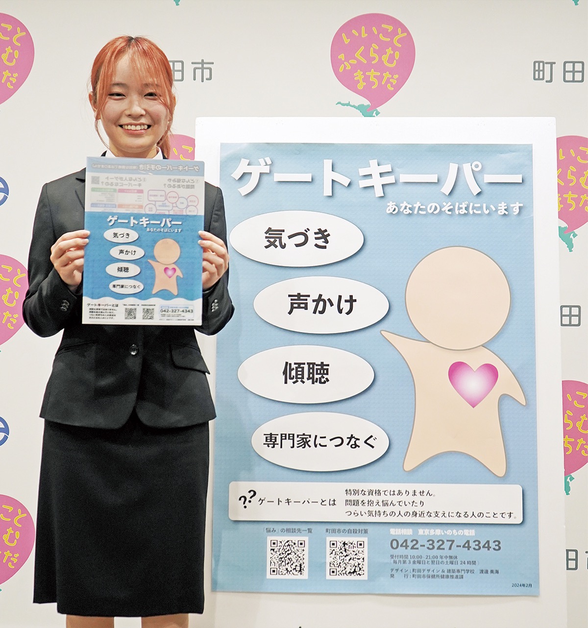 町田市は先ごろ、身近な人の悩みに気づき支える役割を担う「ゲートキーパー」の啓発ポスターデザインを手がけた町田デザイン&建築専門学校(森野)の渡邊美海さん(グラフィックデザイン科1年)=写真・人物風土記で紹介=を表彰した。同校学生の作品を対象に選考を進めてきたもので、29作品の応募があったなか、渡邊さんは市長賞を受賞。石阪丈一市長から表彰状が手渡された。