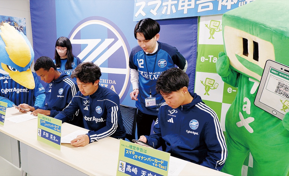 今月16日から開始した確定申告期間に先駆けて14日、FC町田ゼルビアの選手によるスマートフォンを用いた確定申告体験が同チームクラブハウスで行われた。