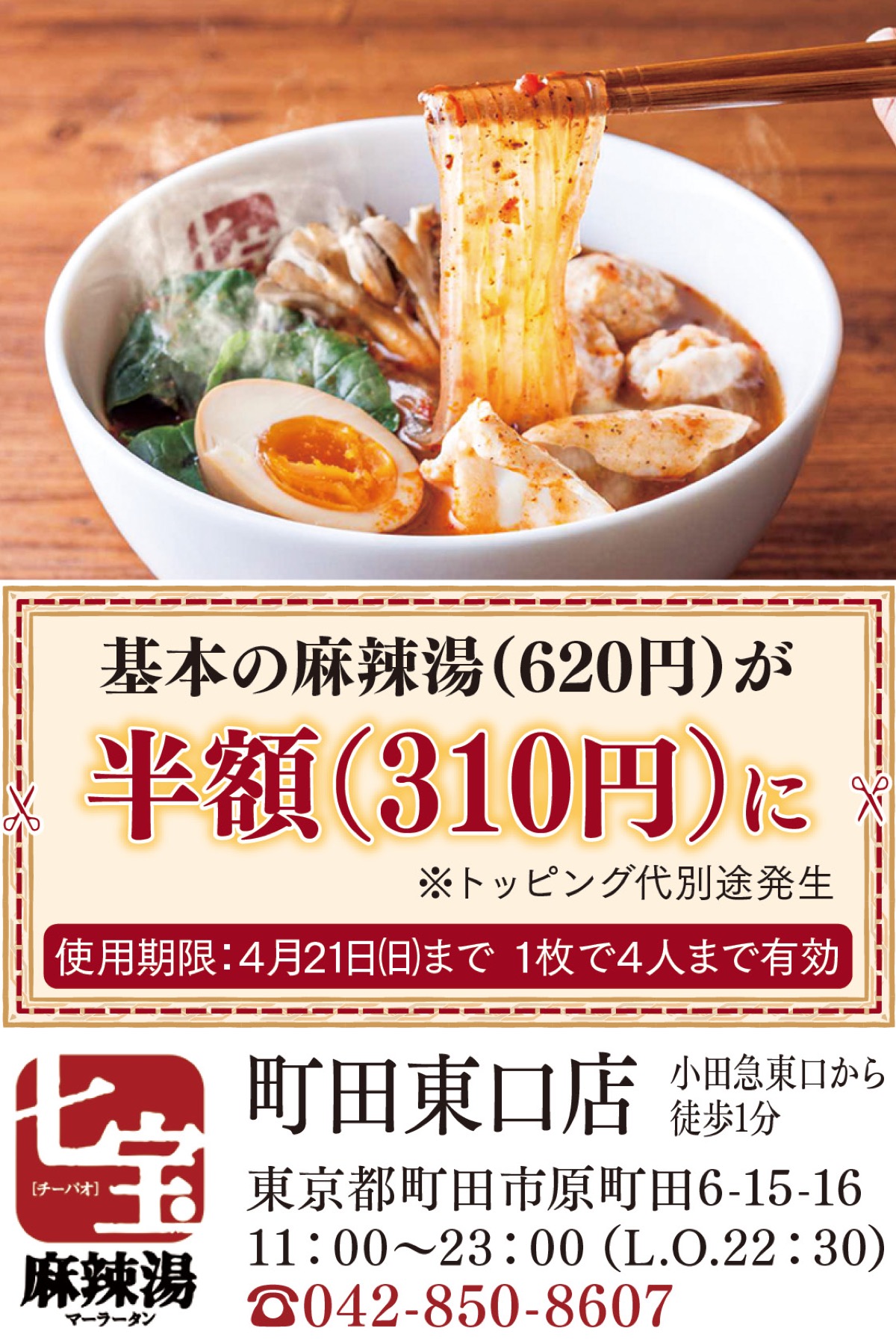本紙持参で基本麻辣湯が半額に。4月21日(日)まで。