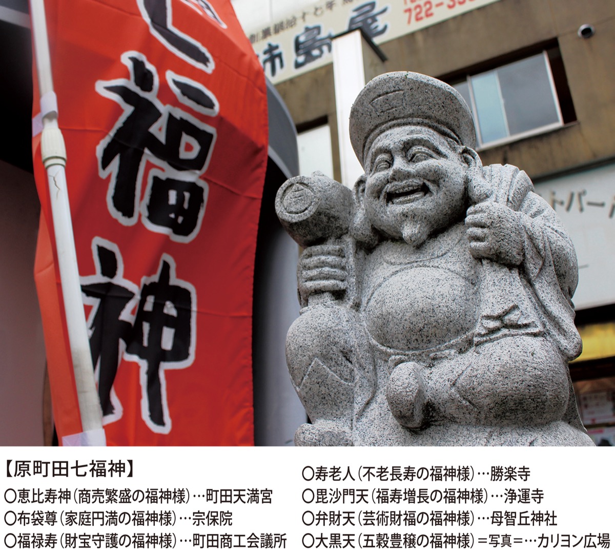 七福神が町田駅周辺市街地に登場したのは2009年。町田市制施行50周年を記念するものとして、商売繁盛の福神である「恵比寿神」や家庭円満を願う「布袋尊」などの7体が原町田の商店主らの手によって建てられた。