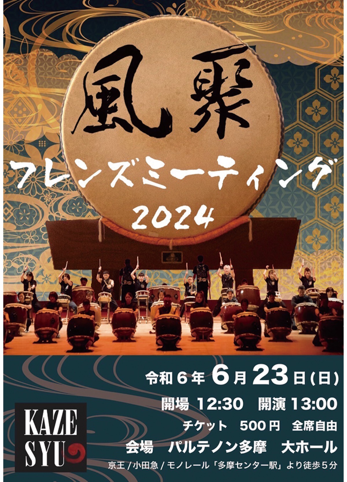 風聚(かぜしゅう)フレンズミーティング2024が6月23日(日)、多摩市の複合文化施設パルテノン多摩の大ホールで開催される。午後1時開演(12時30分開場)。和太鼓集団「風聚」のメンバーが指導もしくは所属している和太鼓団体が一堂に会して、それぞれの個性を発揮した演奏を披露する。