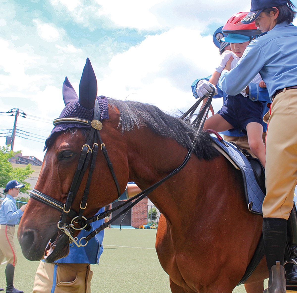 一方で、交通安全教室と共に実施されている恒例の乗馬体験=写真=が今年も行われ、来園した警視庁騎馬隊の迫力に園児らは興奮。順番に馬の背中へ乗り、笑顔を振りまきながら園庭をまわった。