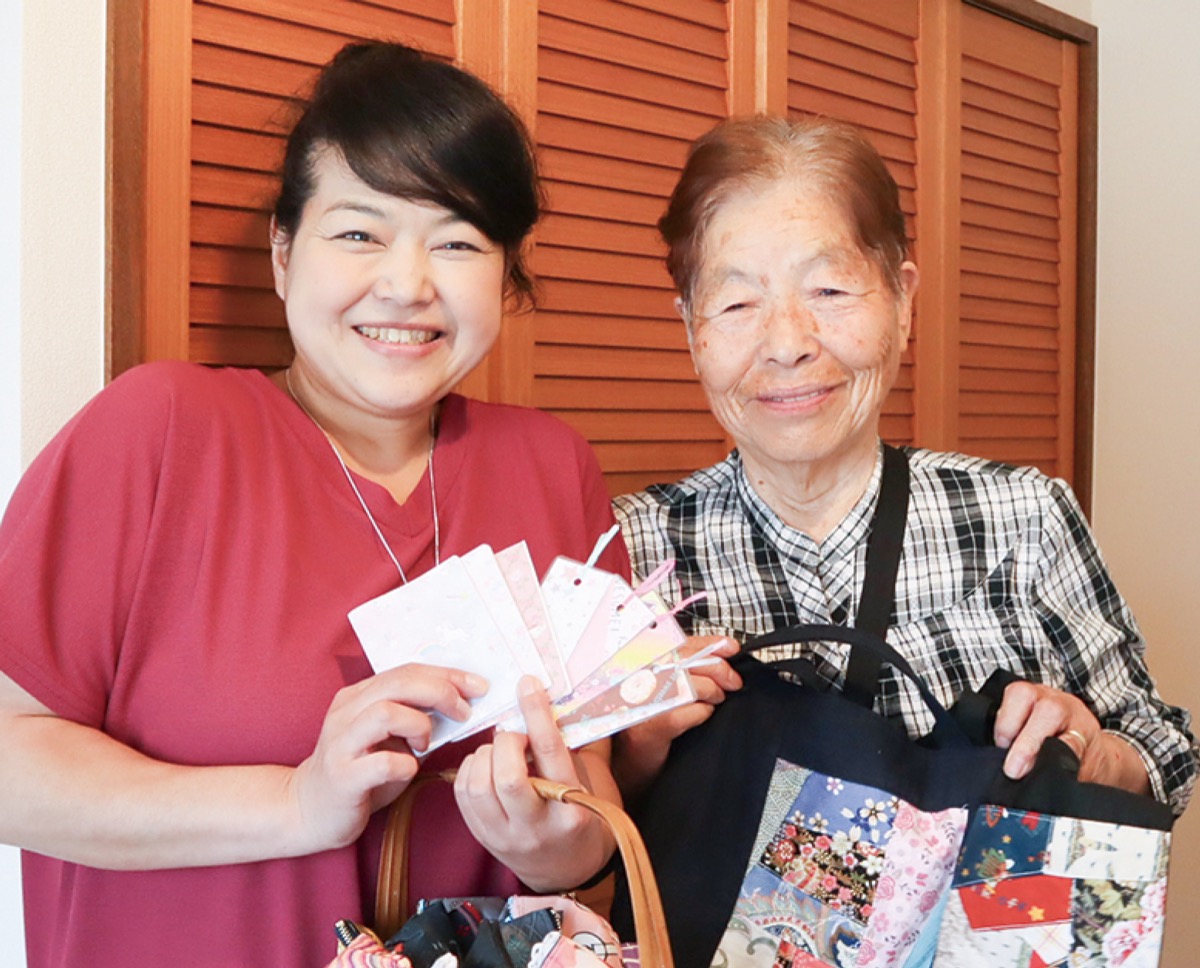 村野さんは自作の手芸品を販売し、元気になっていったというおばあちゃんの宝箱のメンバーらを見て、「後期高齢者など、支援を受ける側になっても誰かの役に立つことが生きる力になると実感した」と商品づくりに励む祖母らを見つめながら話している。