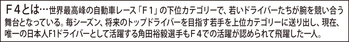 F4は、世界最高峰のレースとして名をはせる「F1」ドライバーを目指す人が最初の関門として位置付けるレース。通常の自動車とは異なる「フォーミュラ」というレーシングカーに乗り、順位を競う。