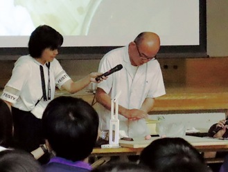 講演会では、和菓子づくりの実演も行われ、ブロック状だったあんこがみるみると「お菓子」になっていく様子に生徒らからは「すごい」「おいしそう」などの声があがった。