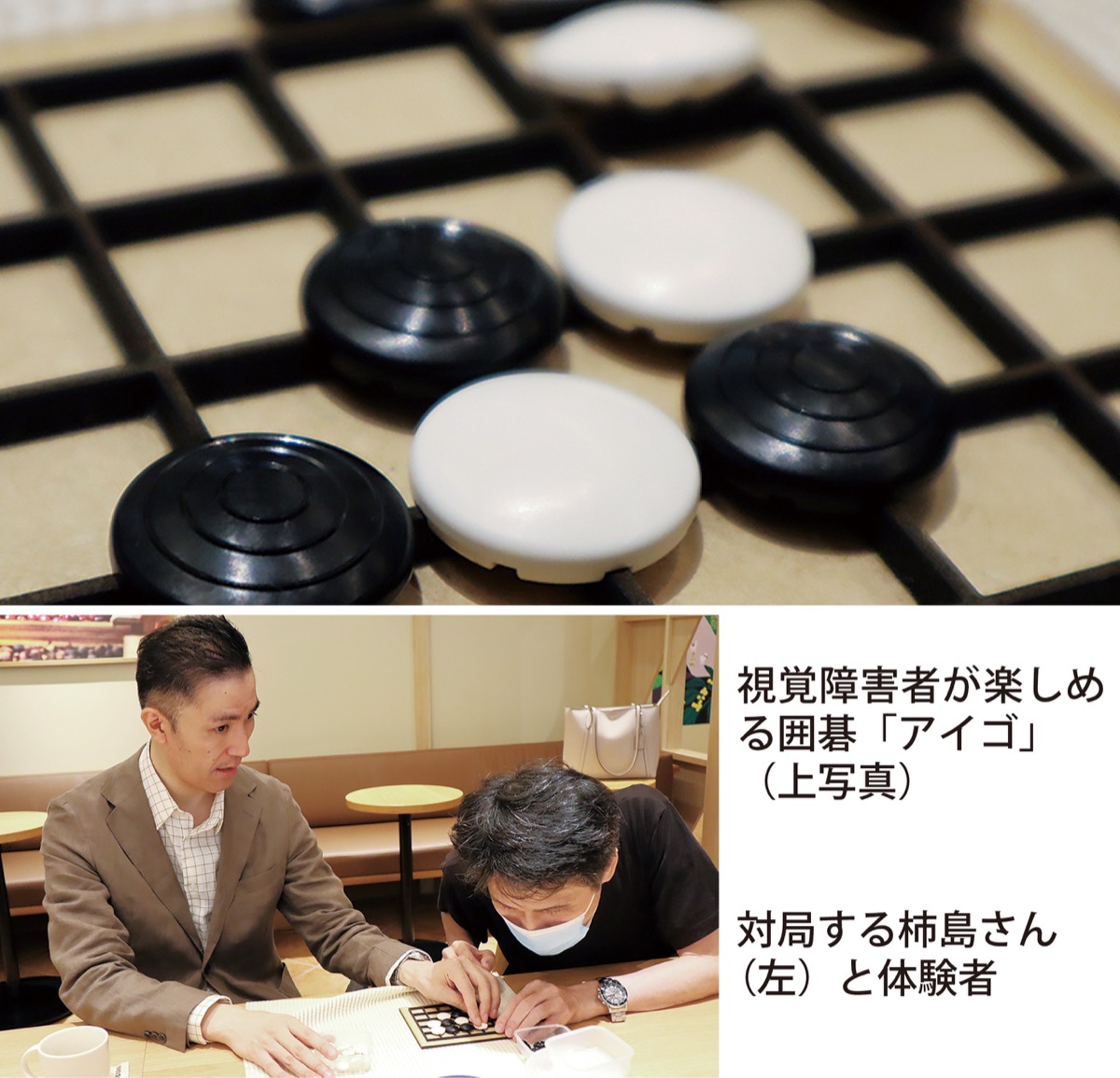 囲碁を通じて、健常者と視覚障害のある人が交流する集まりが今月から始まった。その輪のなかにあるのが、指の感触で碁石の白と黒を判別するなど、視覚障害者が楽しめる囲碁「アイゴ」。日本視覚障害者囲碁協会の代表理事で、アイゴを広めている柿島光晴さんが指導にあたり、参加者を迎え入れている。