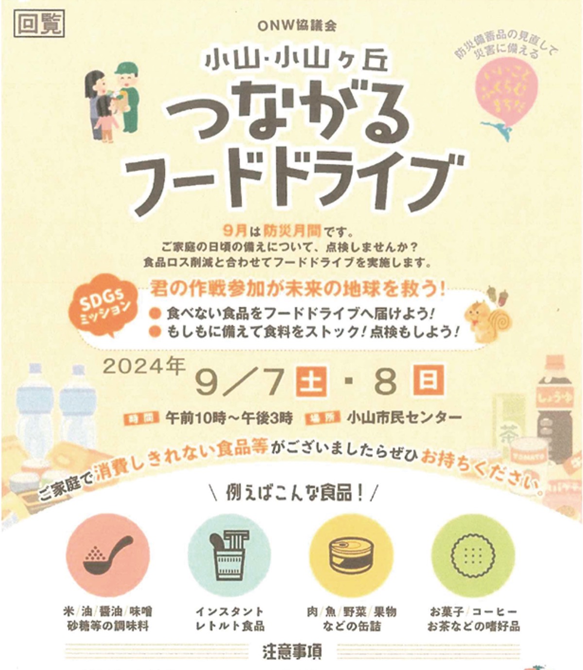 「小山・小山ヶ丘つながるフードドライブ」が9月7日(土)、8日(日)の2日間、小山市民センターで開かれる。各日午前10時から午後3時まで。主催はONW協議会。
