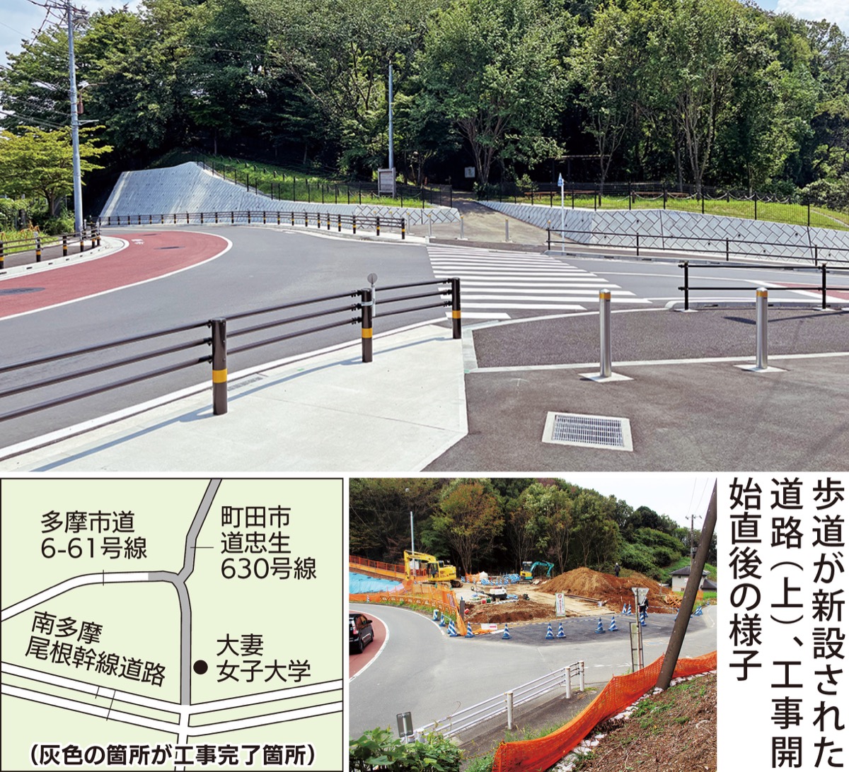 町田、多摩両市を結ぶ道路の整備がこのほど完了した。大妻女子大学多摩キャンパス(多摩市)付近でおよそ2年前から行われてきたもので、町田市道忠生630号線と多摩市道6-61号線の拡幅や歩道の新設が実施された。
