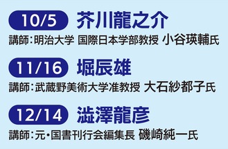 第1回は10月5日、芥川龍之介をテーマにし、11月16日(土)に堀辰雄、12月14日(土)は澁澤龍彦を題材にする。いずれも午後2時から3時30分まで。定員は各回80人(申込順)。観覧無料。申し込みは町田市イベントダイヤル【電話】042・724・5656などから。詳細はことばらんどのHPへ。