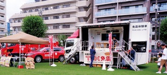 当日会場で従来の 起震車に免震機能を搭載した「 起震免震車=画像」を体験した市内在住の男性は「通常の起震車とはまた異なる揺れの感じ方の違いも体験することができてよかった」と話した。