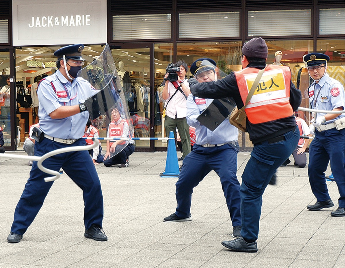 町田警察署、東急セキュリティ株式会社による刃物所持犯人制圧訓練=画像=が先ごろ南町田グランベリーパークで行われた。