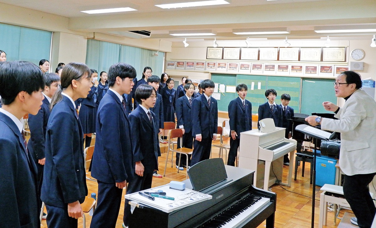全国大会出場は7年ぶり9回目となる。本番に向け、同部では現在、曲の物語性を高め、場面の切り替わりをしっかりできるように練習を重ねているところといい、常にベストの声が出るようにコンディションを整えているという。大会を今月下旬に控え、部長の相田絢音さん(3年)は「聞いている人に届くように、『言葉』を大切にして歌うことを心がけている。みんなで1つの曲を作っているという意識をもってのぞみたい」と意気込む。もう一人の副部長である三乘陽莉さん(3年)は「全国の舞台は、普通では経験できないこと。努力が実るように、心を一つにして楽しく歌いたい」と目標を語っている。