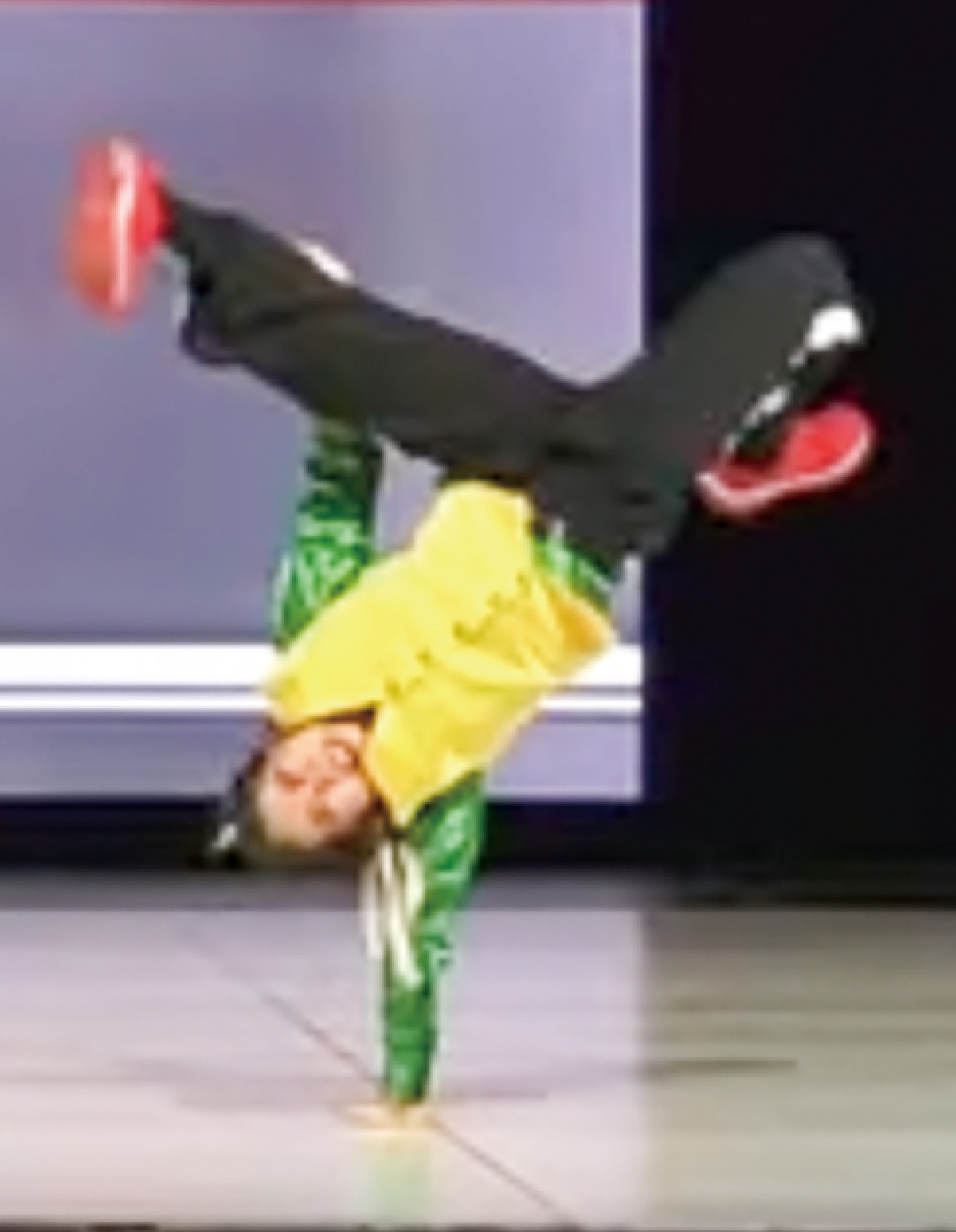 ヒップホップダンスの世界最高峰ともされ、約50カ国が参加した同大会。岩田さんは、所属するコナミスポーツクラブの中から選抜されたチームで出場し、9人でバーシティ部門(13歳〜17歳)、10人でJVメガクルー部門(17歳まで)にそれぞれ出場。双方で銀メダルを獲得した。岩田さんの見せ場となったのは、片手で倒立しポーズを決める場面=写真下=。チーム内で岩田さんが唯一できる技といい、見守った母の陽子さんは「この技と踊っているときの表情が、ひまりの強みだと感じている」と娘の快挙を喜んでいる。
