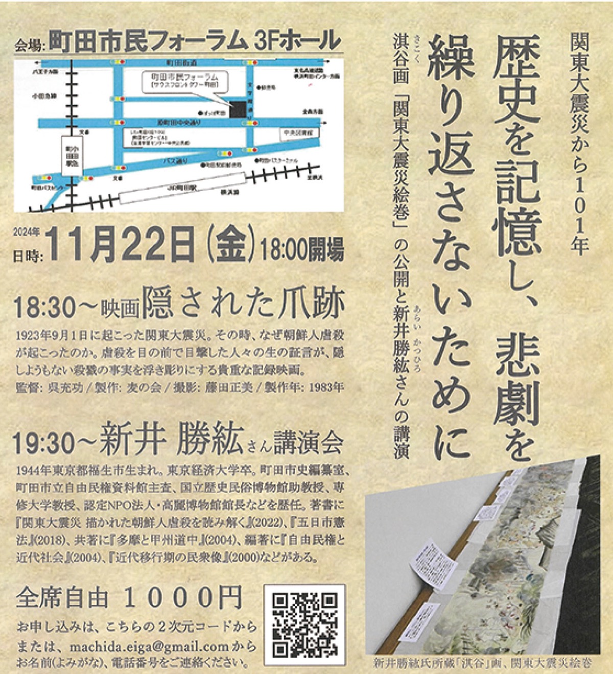 関東大震災後に起こったとする朝鮮人虐殺に関する映画「隠された爪痕」の上映。町田市立自由民権資料館主査、大学教授などを歴任し、著書に「関東大震災 描かれた朝鮮人虐殺を読み解く」がある新井勝紘さんの講演会が開かれるもので、午後6時開場。6時30分から映画上映、7時30分より講演会。全席自由で入場料は千円。