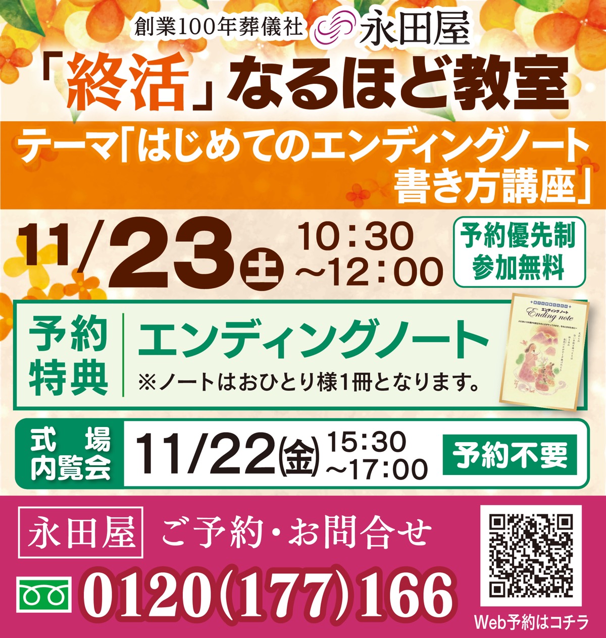 創業百十一年、町田・相模原エリアでナンバーワンの11拠点を構える老舗葬儀社・永田屋は11月23日(土)、小さな家族葬ハウス(R)町田木曽で終活なるほど教室を開催する。参加無料。予約制。