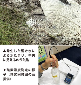 原因究明にあたる地域住民らで構成される「リニア中央新幹線を考える町田の会」によると、小野路の民家で水がわき出し、気泡が発生したのは10月22日。住民が発見し、町田市の水道課に調査を依頼したところ、水道水ではないことが判明。原因を探るなか、町田の会メンバーが現地で気泡を採取し気体を酸素濃度計で計測すると、その他の場所でおよそ20%だった数値が1・0%になったという。24日には、湧き水は止まり気泡を確認することはできなくなったものの、町田の会はリニアの工事に採用されている気泡式シールド工法と呼ばれる方法によって引き起こった可能性が高いとみているという。