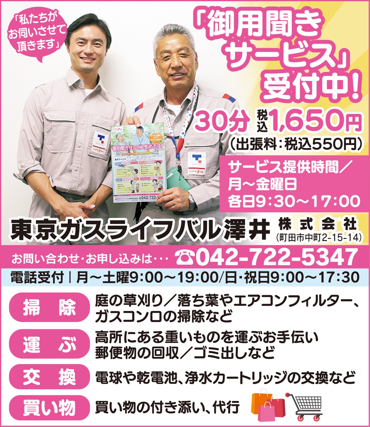 中町の東京ガスライフバル澤井が始めた「御用聞きサービス」が好評だ。30分税込1650円(出張料税込550円)で掃除や買い物、ゴミ出しなどの「困りごと」を代行してくれるもので、9月にスタートすると高齢者や子育て世帯などの利用が増えている。最近は枯れ葉の処理などの依頼もあるといい、同社の澤井宏太さんは「些細なことでも、『こんなことを手伝ってほしい』とご相談頂ければ。可能な限り対応させてもらいます」と話している。