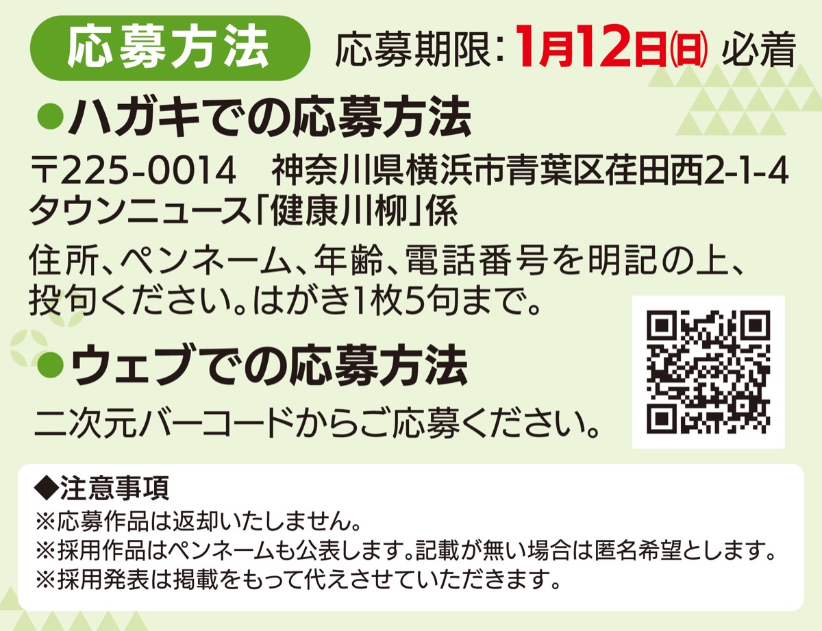 川柳のテーマは「健康」。スポーツや食生活、禁煙、禁酒、身体活動、健康診断・検診といった健康にまつわる川柳を考えてもらい、健康への関心を高めてもらうことを目指す。応募作品から数点を、町田市みんなの健康だより2025年3月1日号の紙面で紹介する。応募方法は下記を参照。問い合わせは(株)タウンニュース社PPP戦略課【電話】045・913・1220(町田市受託事業者)。